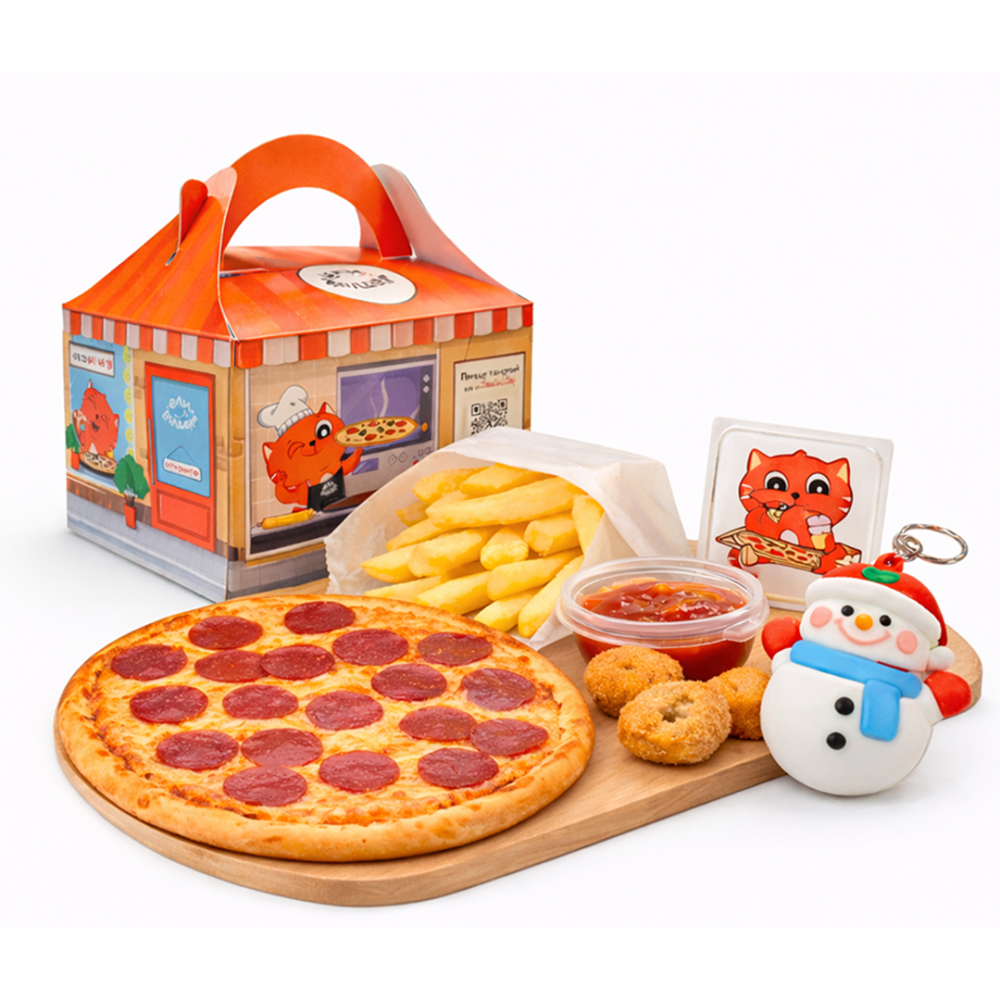 Пицца «Салями» 25 см. Картофель фри 80 г, 4 наггетса, кетчуп, игрушка в подарок, 3D наклейка фирменная.