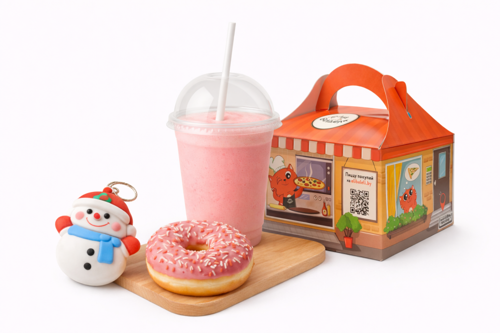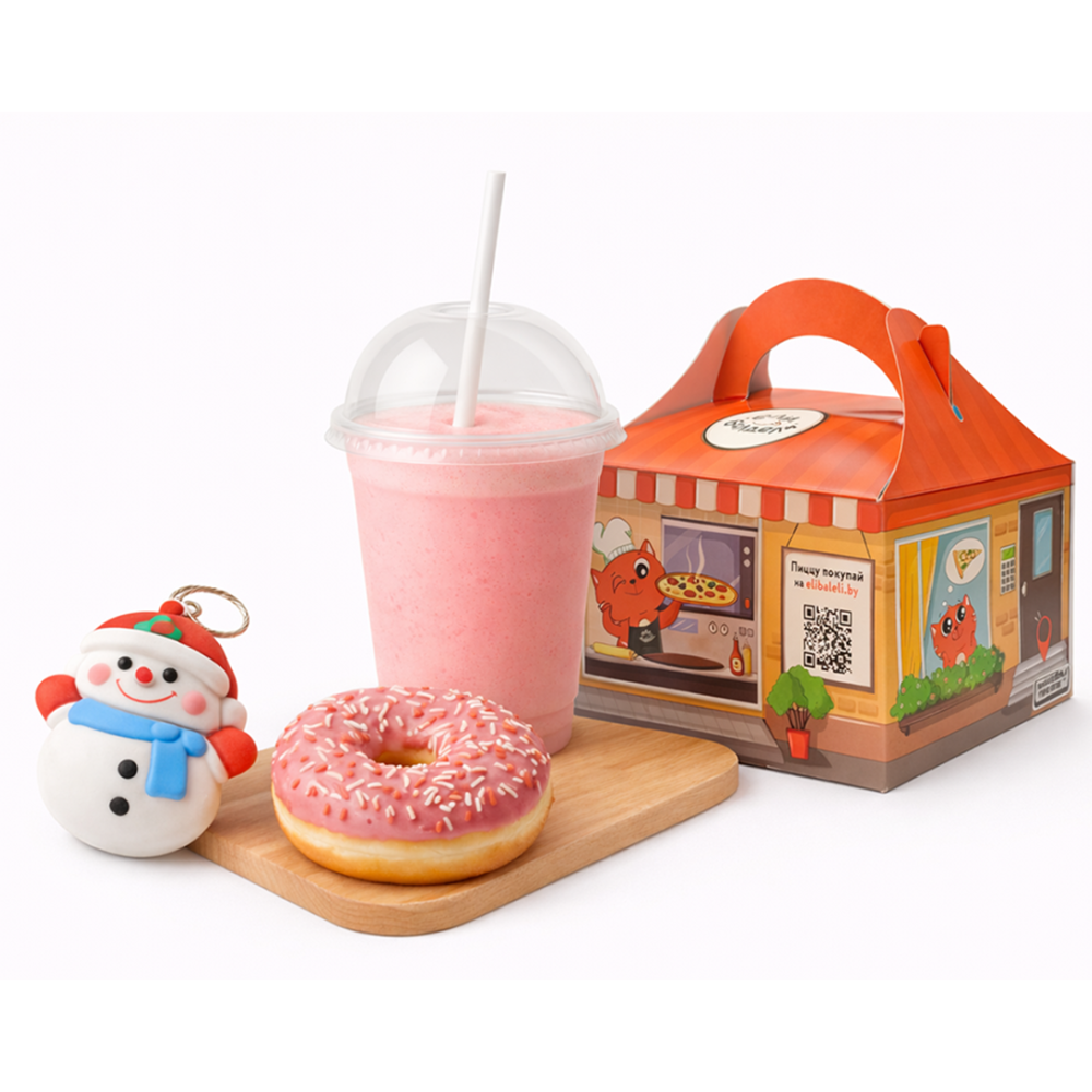 Молочный коктейль (на выбор клубничный, карамель, малина, апельсин, клен, груша, фисташка, миндаль, лесной орех, черная смородина) и пончик (на выбор карамель, клубника, шоколад) Укажите в комментариях, какой сироп и пончик Вы выбрали.