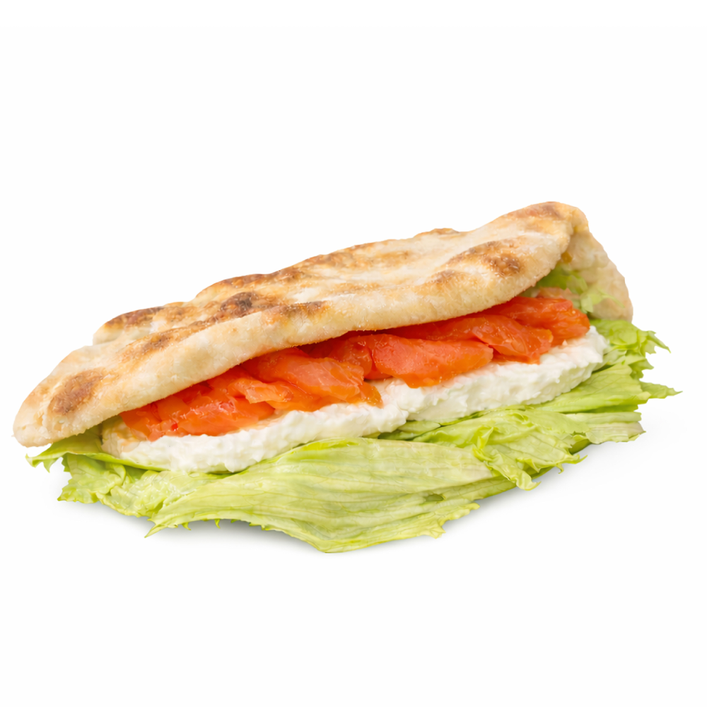 Лосось, сливочный соус, айсберг, сыр творожный, помидоры, лепешка собственного приготовления