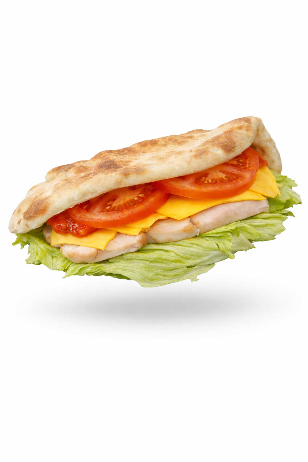 Копченая курица, томатный соус, айсберг, сыр чеддер, помидоры, фирменный чесночный соус, лепешка собственного приготовления