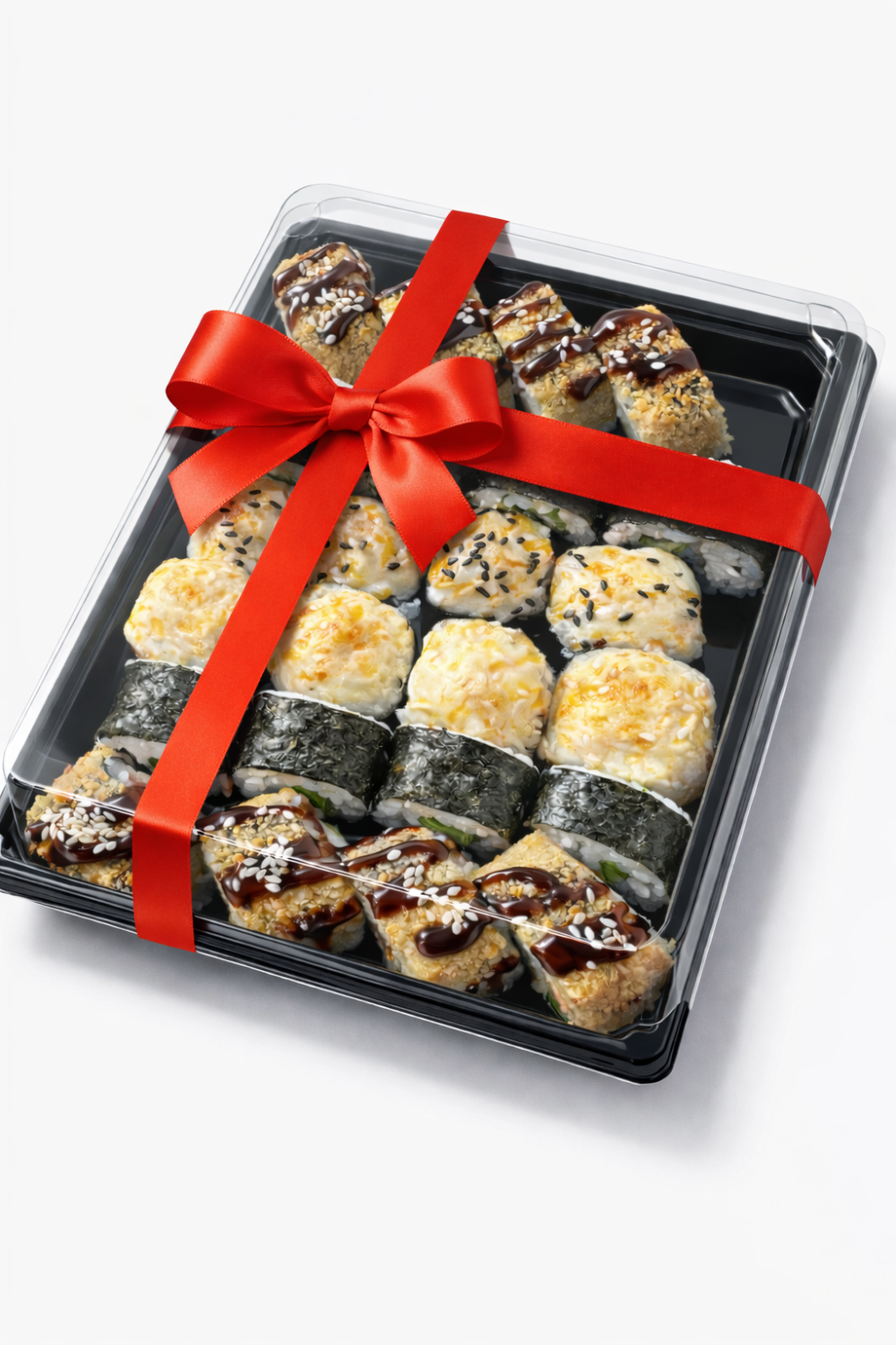 В сет входит: 1 фирменный соевый соус, 1 комплект палочек.