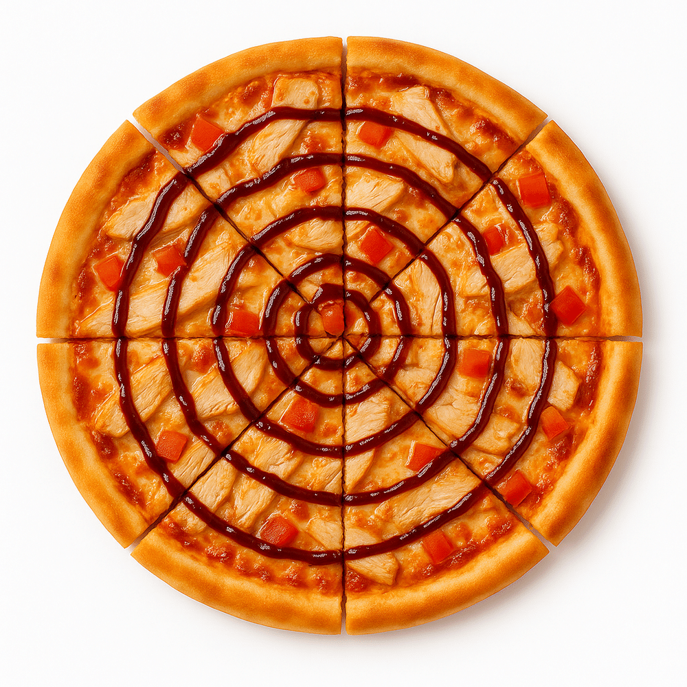Копчёная и жареная курочка, барбекю-соус, моцарелла помидоры (черри или обычные томаты, могут быть изменения в составе), масло чесночное 545гр