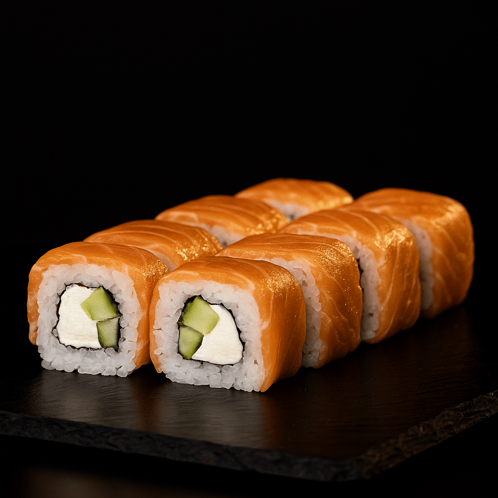 Ролл «Филадельфия» — рис, нори, сливочный сыр, слабосолёная форель и свежий огурец. 8 шт