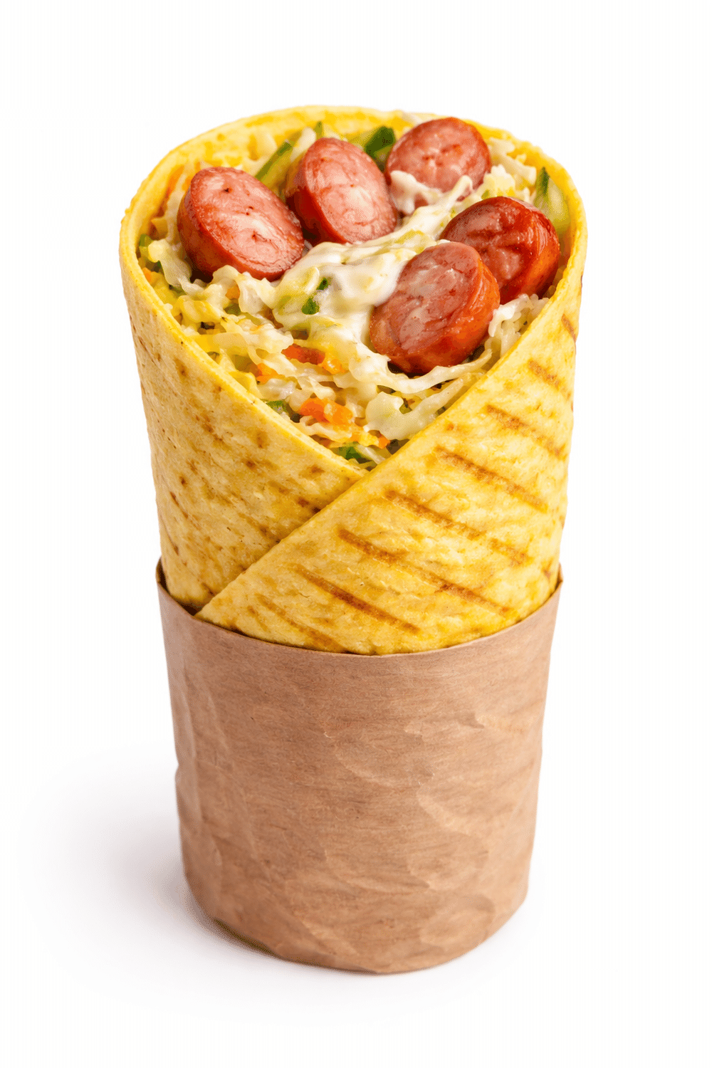 Лаваш, соус грибной и чесночный с зеленью, охотничьи колбаски, капуста. Изображение носит иллюстративный характер.