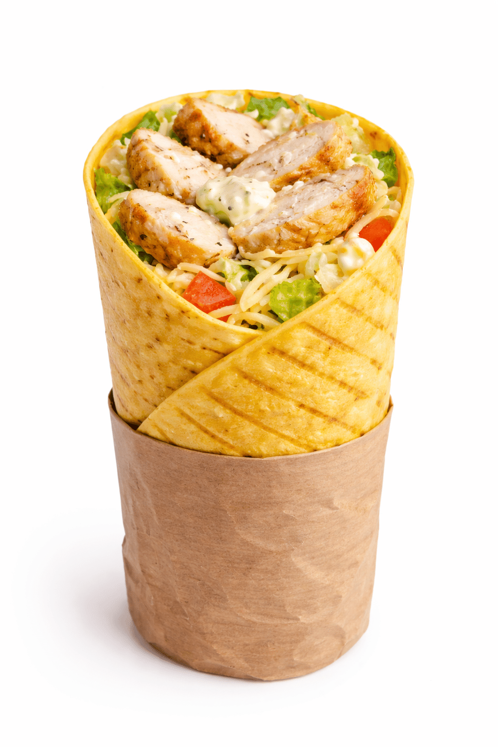 Лаваш, салат айсберг, запеченная курица, помидоры, пармезан, яйцо, соус цезарь. Изображение носит иллюстративный характер.