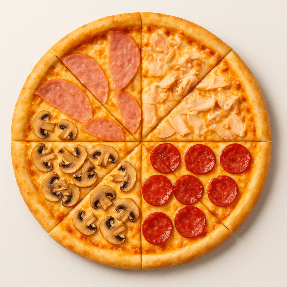 Ветчина, сервелат, копченая курица, шампиньоны, томатный соус, моцарелла, масло чесночное 355 гр / 505 гр