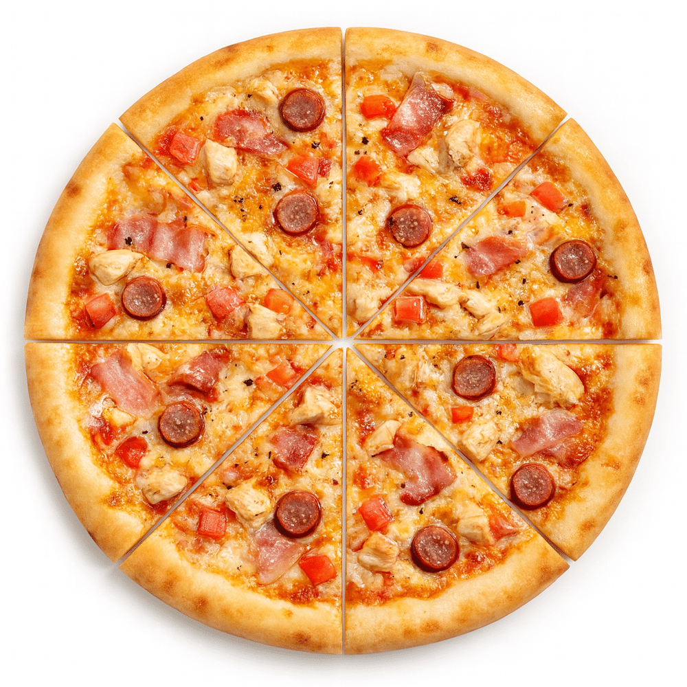 Бекон, охотничьи колбаски, курица, помидоры,томатный соус, моцарелла, масло чесночное 360 гр / 520 гр