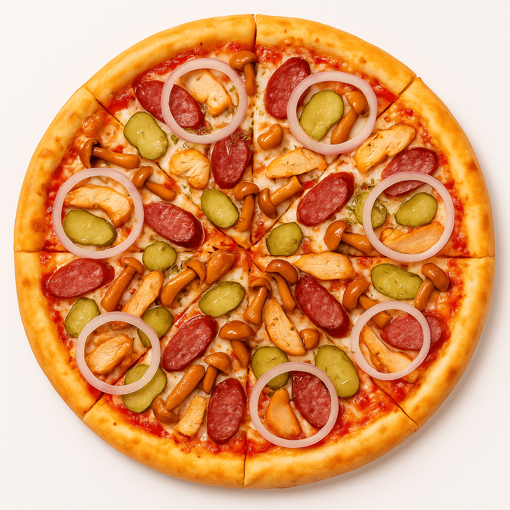 Копченая курица, кабаносы, маринованные грибочки и огурчики, маринованный лук, томатный соус, моцарелла, масло чесночное 400 гр / 570