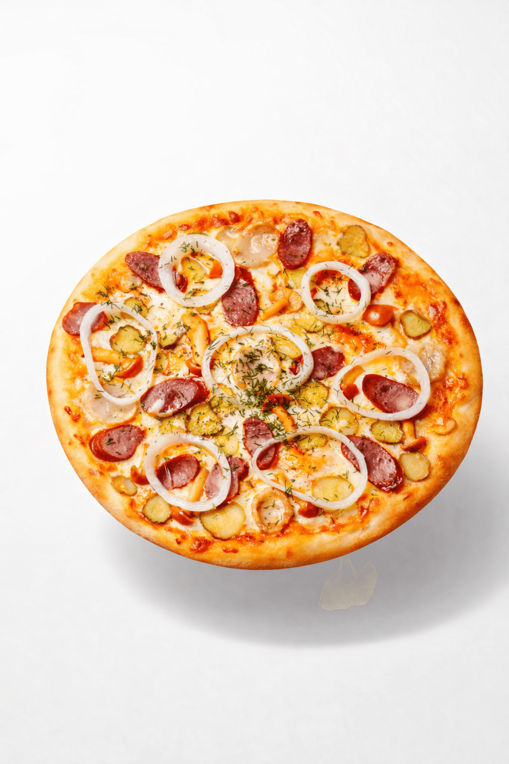 Копченая курица, домашние колбаски, маринованные грибочки и огурчики, маринованный лук, томатный соус, моцарелла, масло чесночное 400 гр / 570