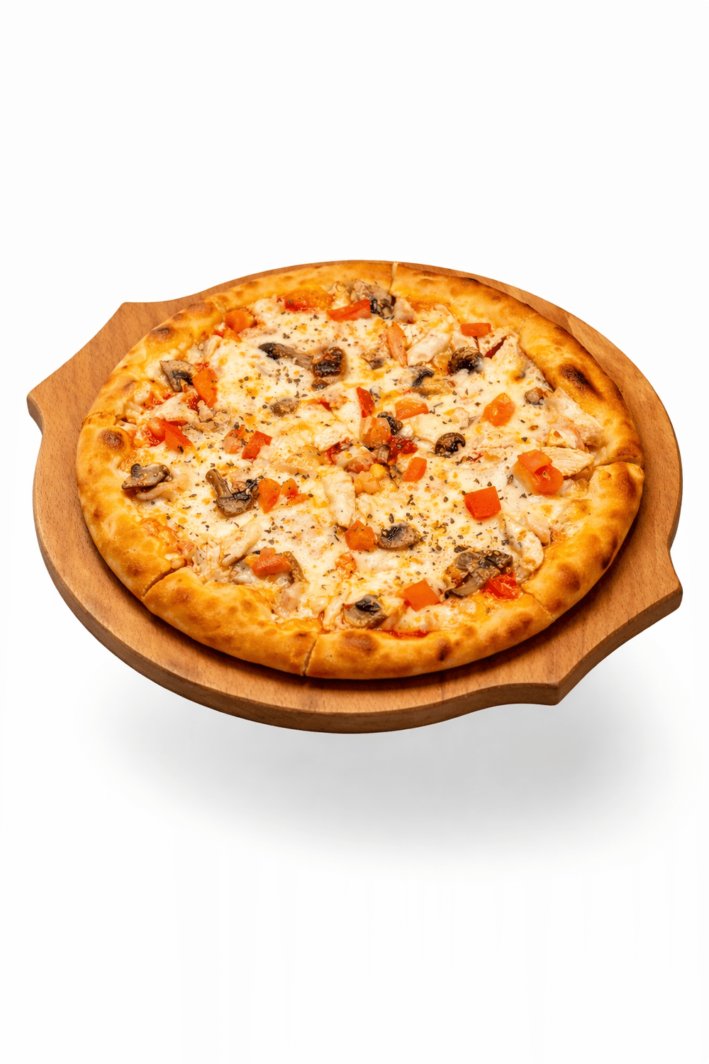 Сервелат, ветчина, копченая и жареная курица, помидоры, шампиньоны, томатный соус, моцарелла, приправа к пицце, масло чесночное 380 гр / 550 гр