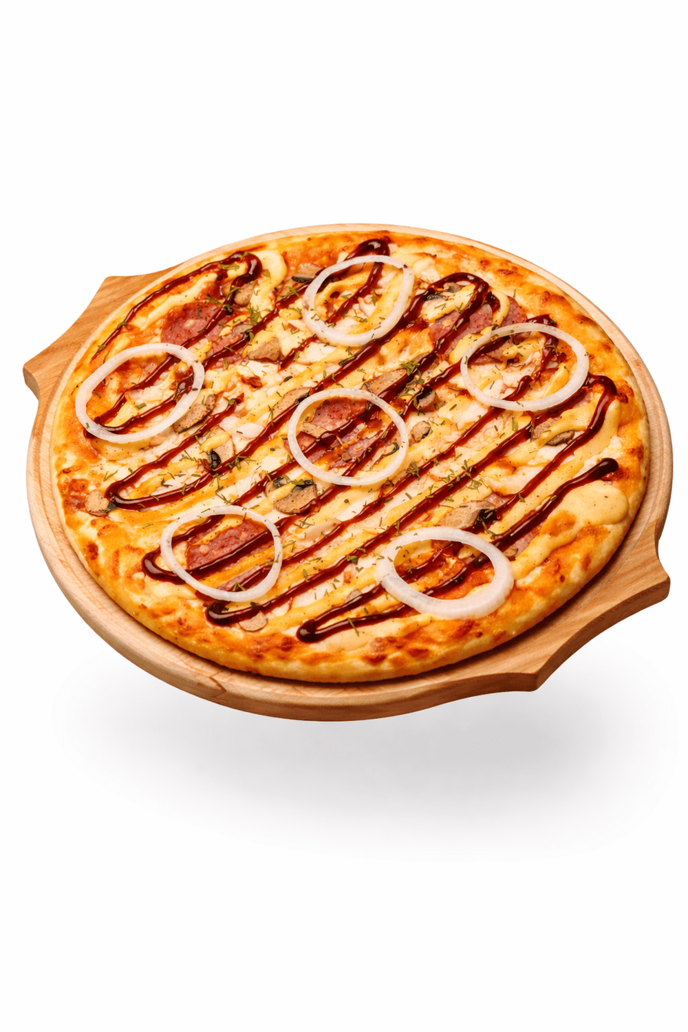 Копченая и жареная курочка, сервелат, шампиньоны, маринованный лук, соус гриль, соус барбекю, моцарелла, томатный соус, масло чесночное 400 гр / 610 гр