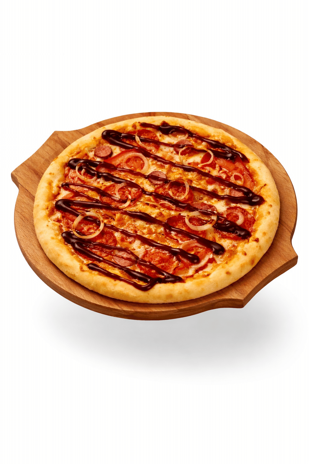 Пепперони, охотничьи колбаски, соус барбекю, помидоры, маринованный лук, томатный соус, моцарелла, масло чесночное 370 гр / 550 гр