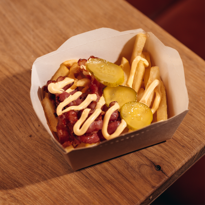 Состав: картофель дольки 120 гр, наггетсы 5 шт, соус чесночный с зеленью 40 гр.