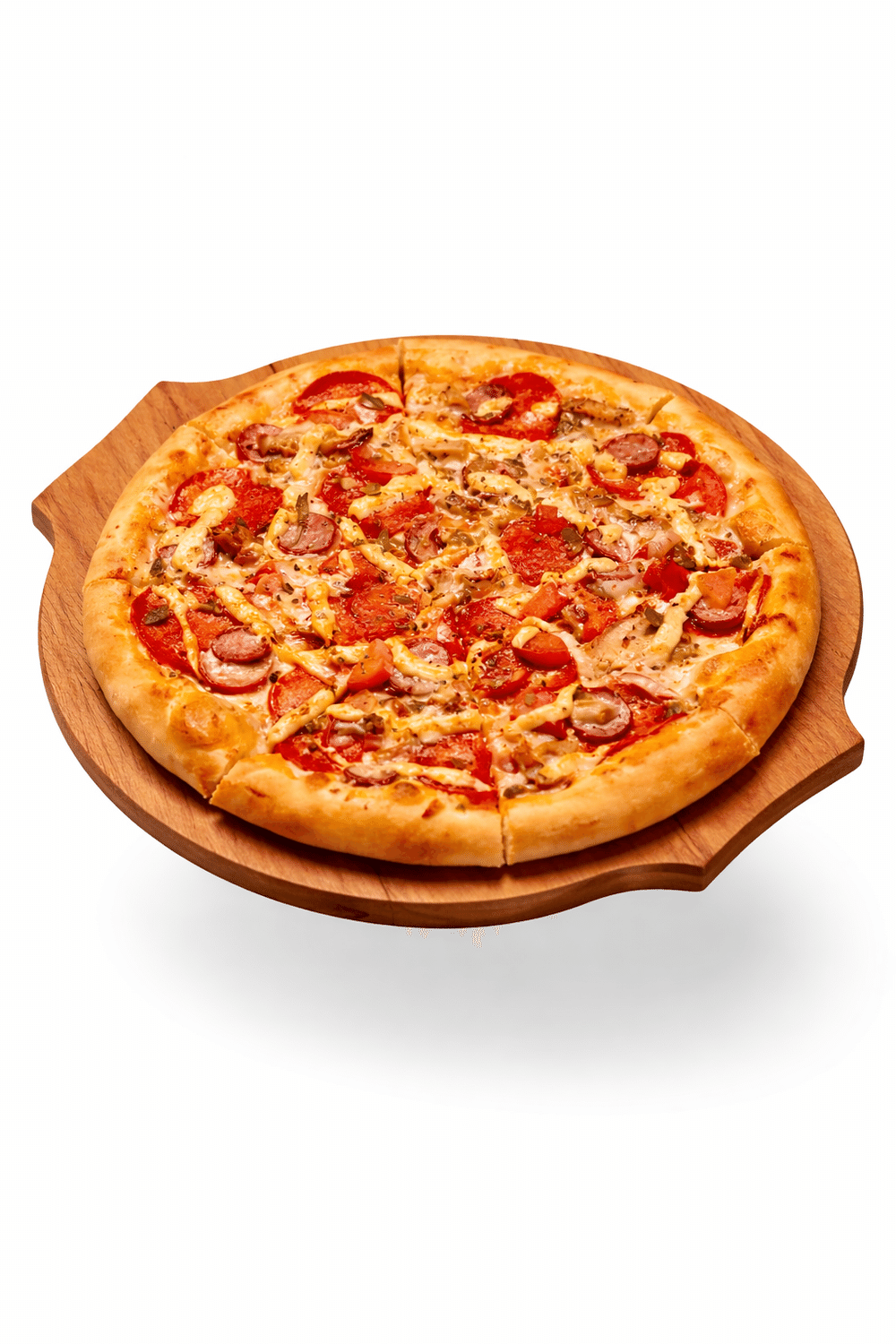 Пепперони, охотничьи колбаски, курица, помидоры, халапеньо, спайси соус, томатный соус, моцарелла, чесночное масло 410 гр / 585 гр